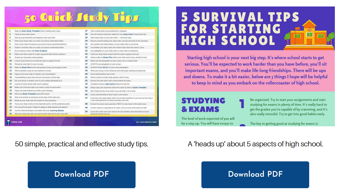 Cramlab.org also has a Printouts page where you can download the free resources available, which at the time of writing include 50 Quick Study Tips and 5 Survival Tips for Starting High School.